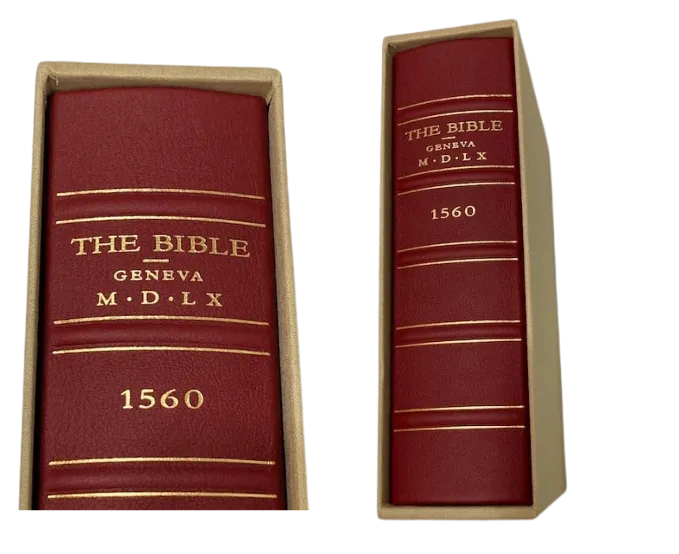 Bound in imported Spanish leather and housed in a protective display box, it mirrors the original 1560 edition on display at the Museum of the Bible.