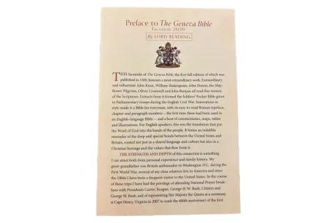 The Geneva Bible is a historic English translation first published in 1560. It was the primary Bible of the Protestant Reformation and used by the Pilgrims and many of America’s founders.