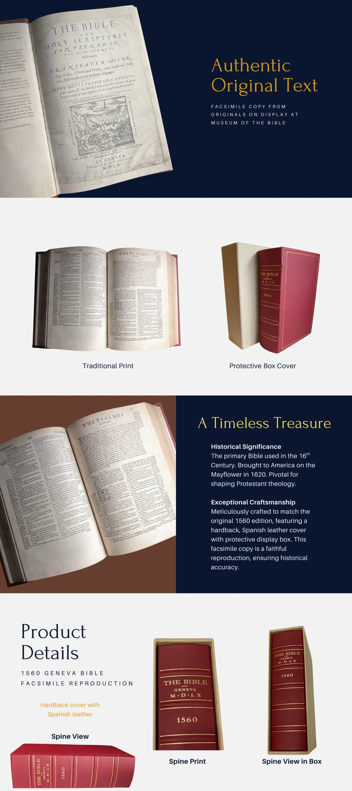 At The Great Awakening Project, we trust in the power of history to inspire and create meaningful connections. The 1560 Geneva Bible is a rare, limited-edition facsimile of the first English Bible brought to America on the Mayflower, offering a unique way to honor donors, enrich libraries, or give a gift with deep significance.